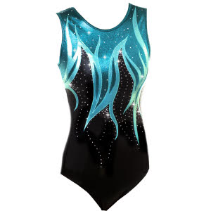 Turnpakjes van glansstoffen in de kleuren zwart, aqua en mint met zilveren steentjes.