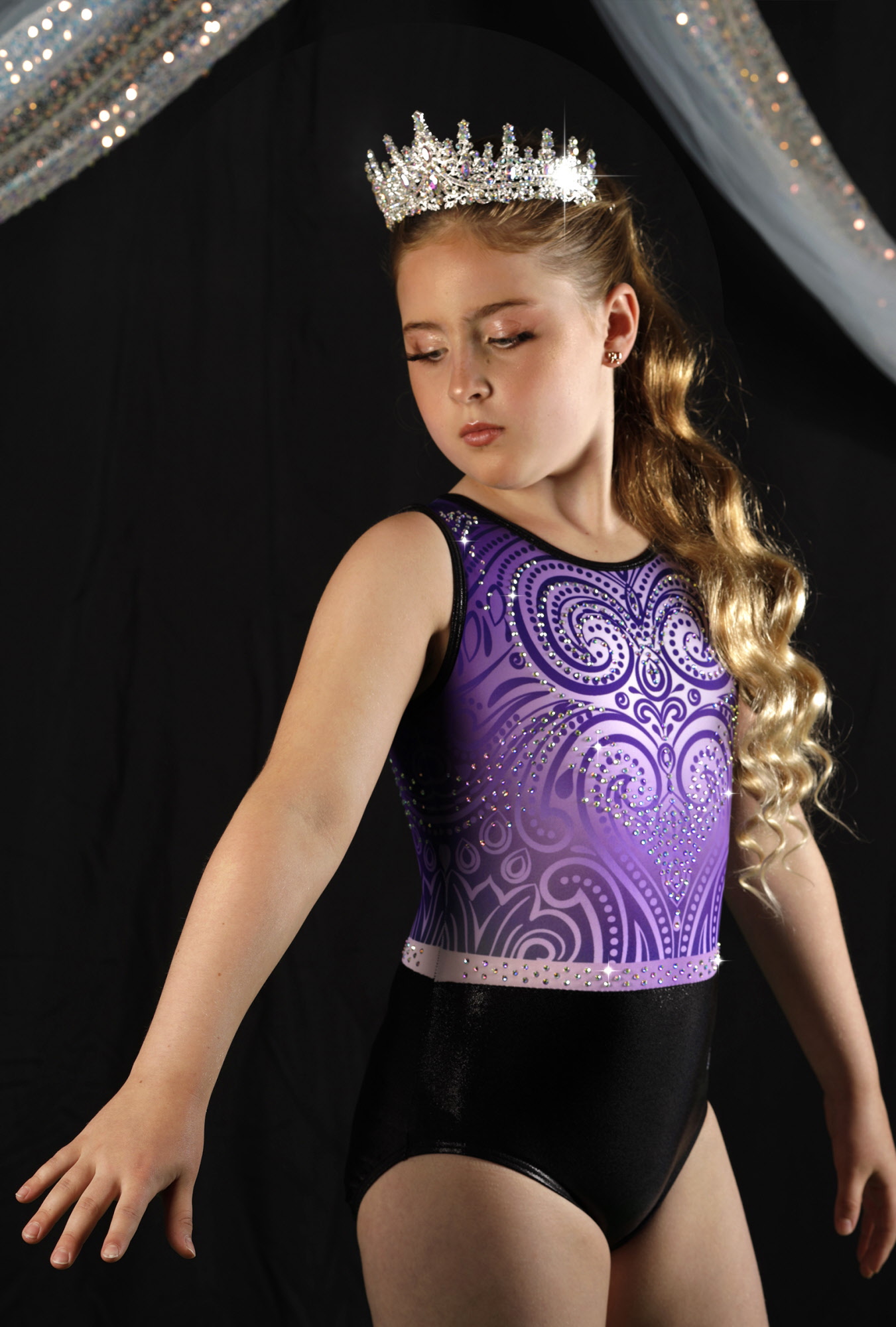 Dit turnpakje straalt luxe en kracht uit met zijn paars bedrukte stof, gecombineerd met een elegante onderkant van zwarte glansstof. De talloze steentjes met een gekleurde schittering laten je schitteren bij elke beweging.
